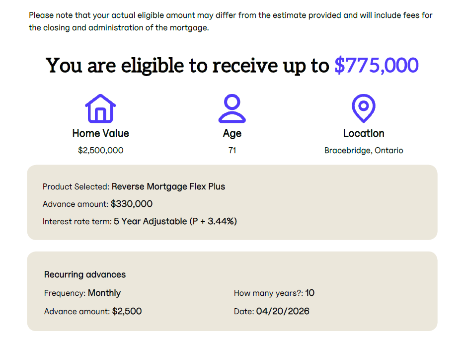 Based on the attached Equitable Bank illustration, their home in Bracebridge, Ontario, is valued at $2,500,000. The youngest spouse is 71. The report shows eligibility of up to $775,000 and models a Reverse Mortgage Flex Plus strategy with an initial advance of $330,000 and recurring monthly advances of $2,500 for 10 years.