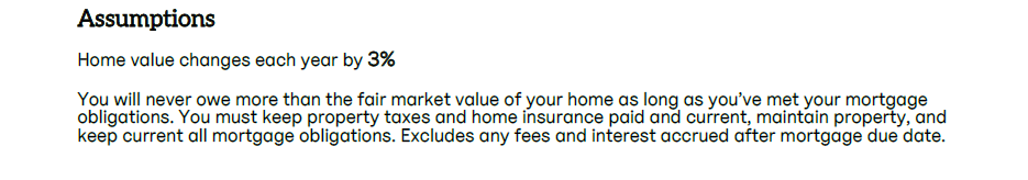 The results shows the estimated remaining equity in your home over a period of time. The estimated remaining equity in your home is the difference between the value of the home and the total amount owing on the reverse mortgage at the end of the selected time period. The estimated remaining equity is based on the following assumptions: