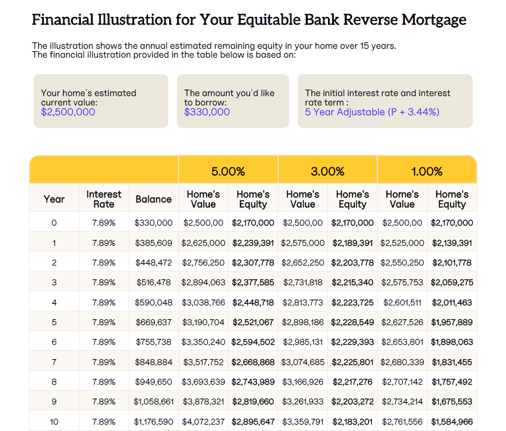 The attached Equitable Bank illustration shows the reverse mortgage balance and remaining equity after 10 years. In the best-illustrated scenario, using 5% annual home appreciation, the home is projected to be worth $4,072,237 after 10 years. The reverse mortgage balance is projected at $1,176,590, leaving an estimated remaining equity of $2,895,647.