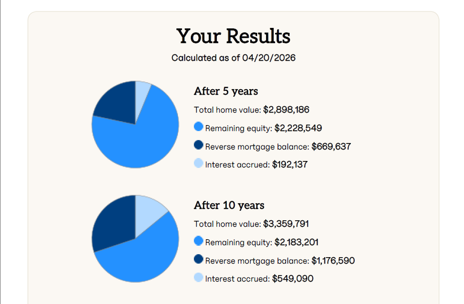 Even after paying off the HELOC, receiving $2,500 per month for 10 years, and accruing reverse-mortgage interest, the couple could still have nearly $2.9 million in projected home equity in the best-illustrated scenario.